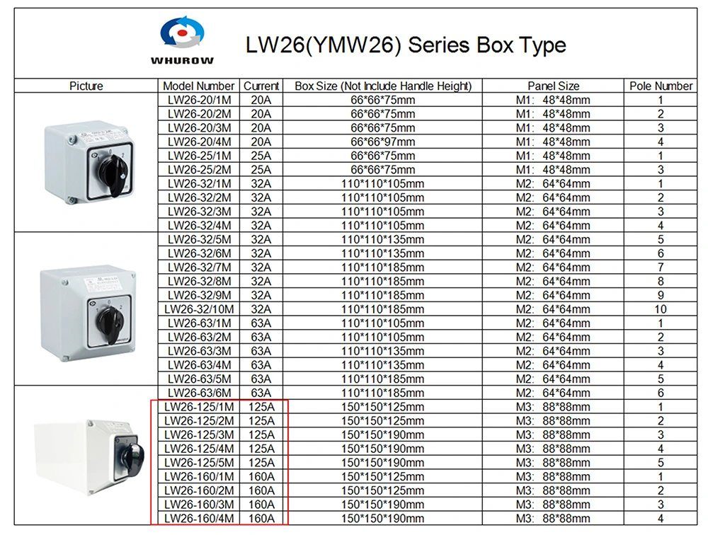 YAMING, un fabricante experimentado con más de 30 años de experiencia en la fabricación de interruptores eléctricos, presenta el interruptor de leva de caja impermeable LW26 125A 160A (modelo interno: YMW26-125M 160M) equipado con una carcasa impermeable. Ofrece una excelente adaptabilidad a diversas condiciones de trabajo, funciones versátiles y un alto rendimiento de seguridad, lo que lo convierte en una opción ideal para control de circuitos, control de motores, equipos de prueba y escenarios de control principales.