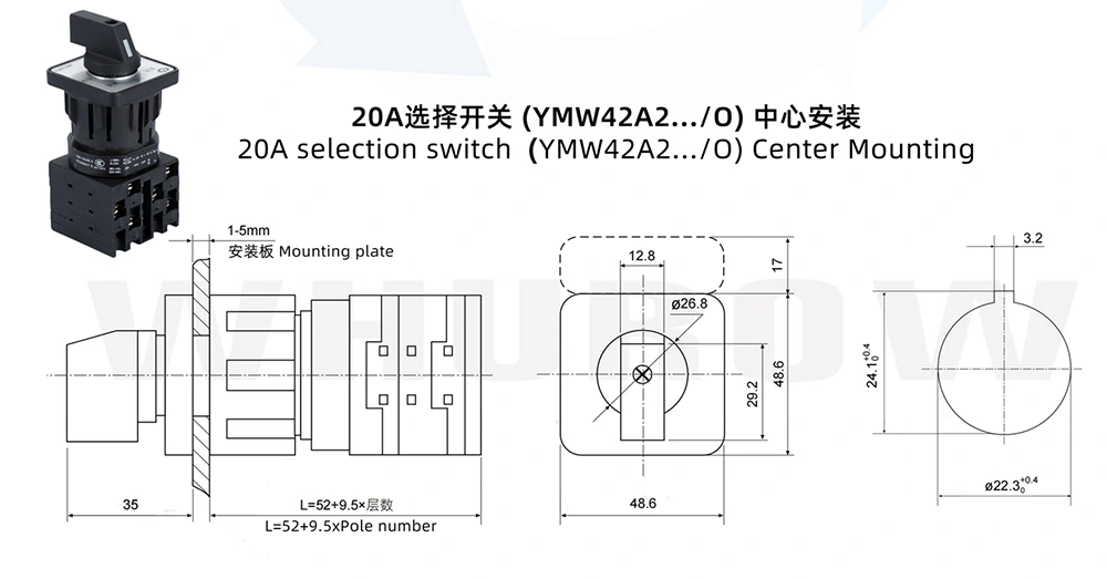 El interruptor de leva de múltiples posiciones alargado montado en orificio central de 20 A (modelo interno: YMW42-20/O) lanzado por YAMING es un componente de control eléctrico de alto rendimiento diseñado para máquinas herramienta y equipos eléctricos controlados por programa CNC de CA 50 Hz, voltaje ≤ 690 V. Con más de 30 años de experiencia profesional en el sector de interruptores eléctricos, YAMING, un fabricante confiable con sede en China, integra una artesanía exquisita y una tecnología excepcional en este producto.