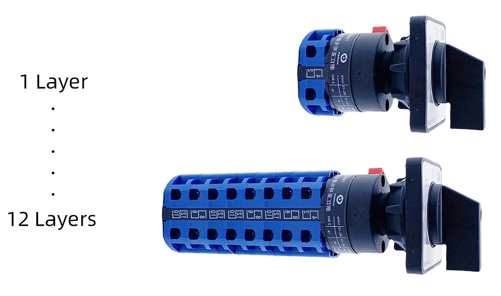 - Componentes del sistema: opciones de capas flexibles: de 1 a 12 capas para interruptores de posicionamiento, de 1 a 3 capas para interruptores de reinicio automático y de 1 a 6 capas para interruptores de control de motores.