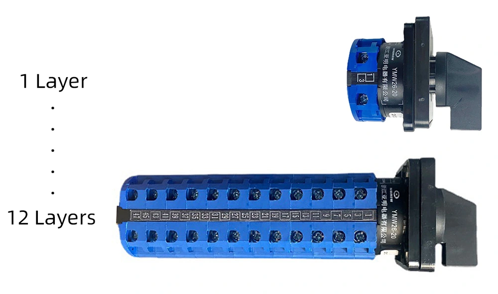 Para satisfacer las necesidades específicas de diferentes clientes, hemos establecido un sistema perfecto de clasificación y personalización. El interruptor se puede dividir en conversión de circuito principal, control de motor, control de comando principal y medición según el propósito; el modo de operación cubre el tipo de posicionamiento, el tipo de reinicio automático y el tipo de reinicio automático de posicionamiento; el número de secciones del sistema se puede seleccionar de manera flexible según el tipo de posicionamiento (1-12 secciones), el tipo de reinicio automático (1-3 secciones) y el tipo de control del motor (1-6 secciones), y se admite la personalización de secciones especiales. El ángulo de conversión proporciona opciones de 30°, 45°, 60°, 90°, y el panel también se puede adaptar a formas cuadradas, circulares, etc., cambiando realmente según las necesidades.